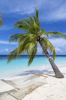 Ca. 220 m x 230 m große, fast kreisrunde Insel mit puderzuckerfeinem Sandstrand und tropischer Vegetation