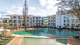 - 46-50 qm, Suite, für Erwachsene ab 18 Jahre, Etage, 1. oder 2. oder 3., Poolblick, separates Schlafzimmer, separater Wohnraum, Doppelbett, 2 Bäder, Dusche, Haartrockner, Klimaanlage, Mini-Kühlschrank, Safe, TV (Smart-TV), WLAN, Wasserkocher, Kaffee/Tee, bodentiefe Fenster, ca. 20 qm großer, möblierter Balkon mit Glasfronten