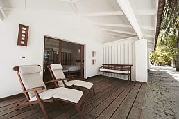 - 51-60 qm, Juniorsuite, Strandlage, Meerblick, optisch getrennter Wohn-/Schlafraum, nach oben halb offenes Bad, Außendusche, WC, Bademantel, Haartrockner, Holzboden, Klimaanlage, Ventilator, Minibar, Safe, WLAN, Wasserkocher, Kaffee/Tee, Terrasse (möbliert)