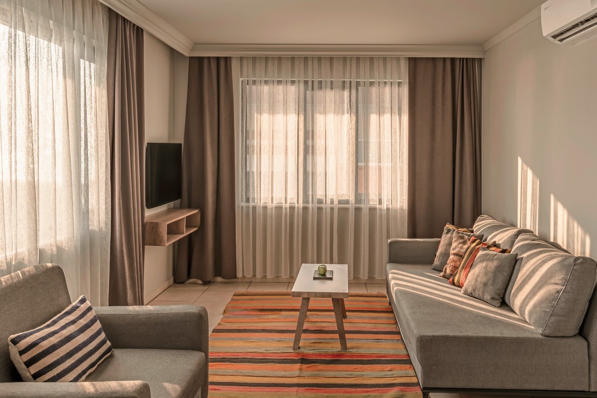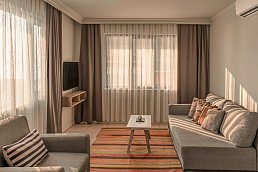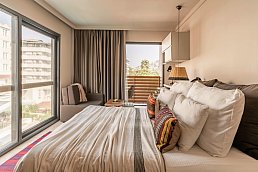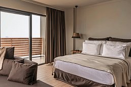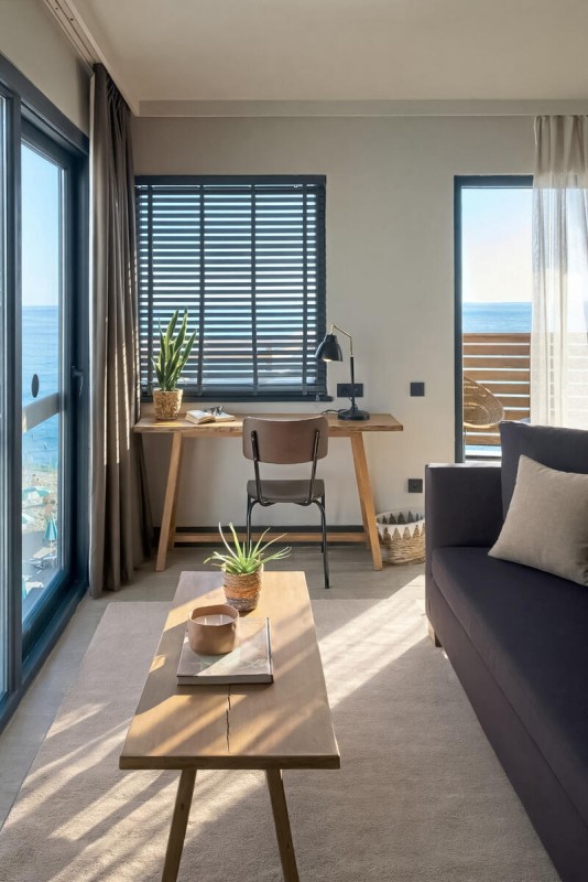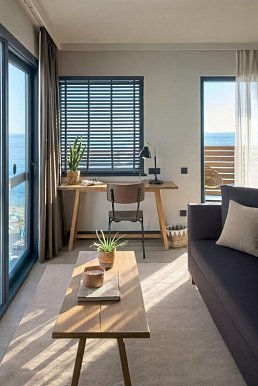 - 31-35 qm, Suite, Meerblick, Nichtraucher, Bettwäsche, Handtücher und Matratzen aus 100% Bio-Baumwolle, separater Wohnraum, Twinbett, Sofabett, Dusche, WC, Badeslipper, Haartrockner, Fliesen, Klimaanlage, Safe, 2 TVs (Sat-TV), Kochnische, Wasserkocher, Kühlschrank, Balkon